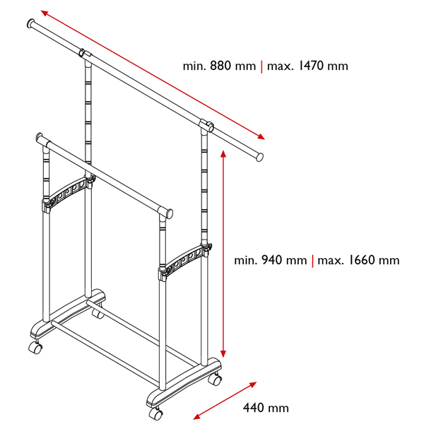 Appendiabiti multiuso facile da trasportare e comodo da usare. Con ampia base di appoggio e tubi estensibili per aumentarne la capacità. Può essere usato come appendiabiti dopo la stiratura, come stendibiancheria per capi ingombranti o in alternativa al classico armadio. Si assembla facilmente senza l’uso di utensili. Dotato di ruote e griglia porta scatole. 2 barre. Misure: base cm 88 estensibile fino a cm 147, altezza cm 94 estensibile fino a cm 166.