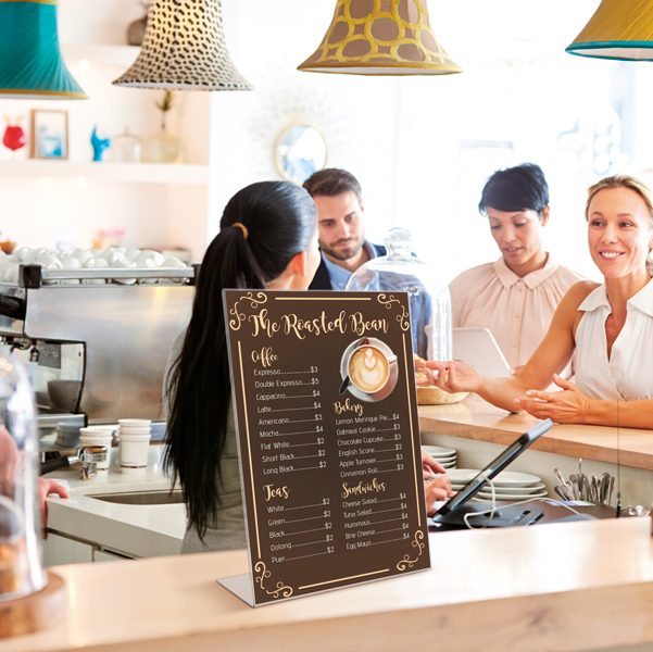Display in PET trasparente (materiale riciclabile) idoneo al contatto con gli alimenti. Ottima resistenza agli urti e al fuoco. Ideale per ogni tipo di comunicazione e perfetto come porta menù o porta listino. Portadepliant con base a L utilizzabile sia in verticale che orizzontale. Formato 1/3 A4 – 10x21cm – spessore 1,5mm.